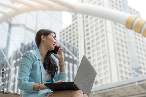 Beautiful Cute Girl Smiling In Business Woman Clothes Using