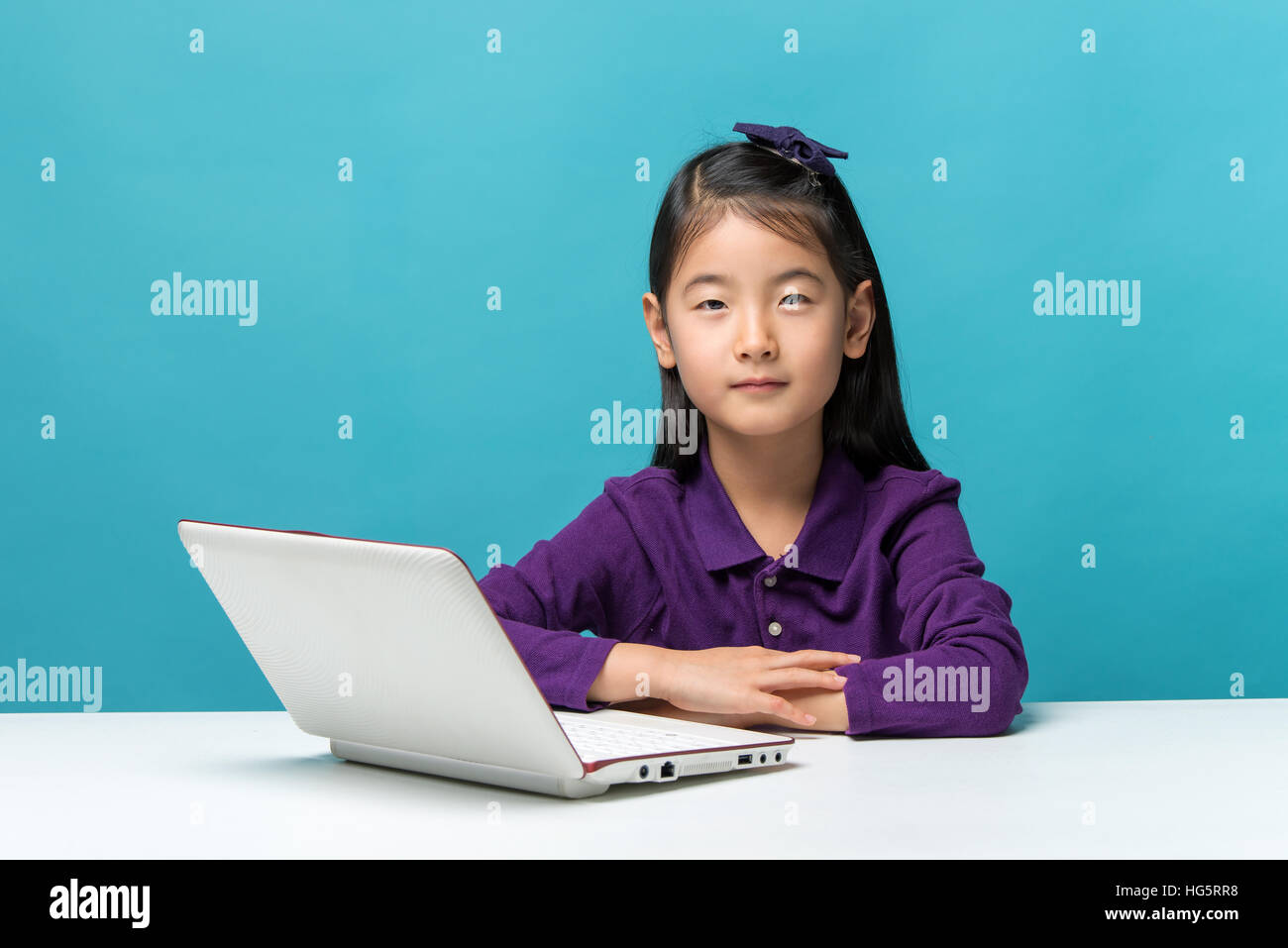 Cute Asia Little Girl Who Enjoy The Laptop Computer On Blue