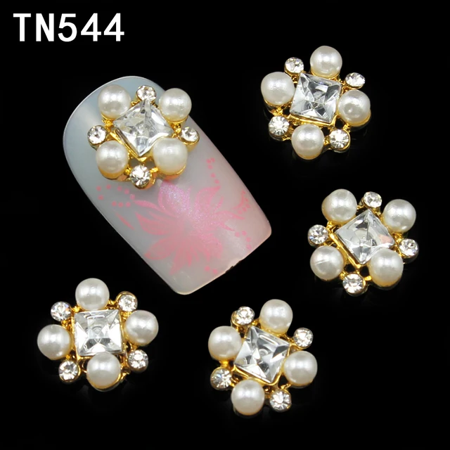 10pcs Glitter Alloy White And Gold Square With Pearl Nail Art With Rhinestones Charms Rhinestones For Nails Nail Tools Tn544 In Rhinestones