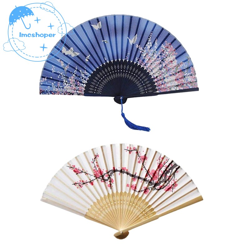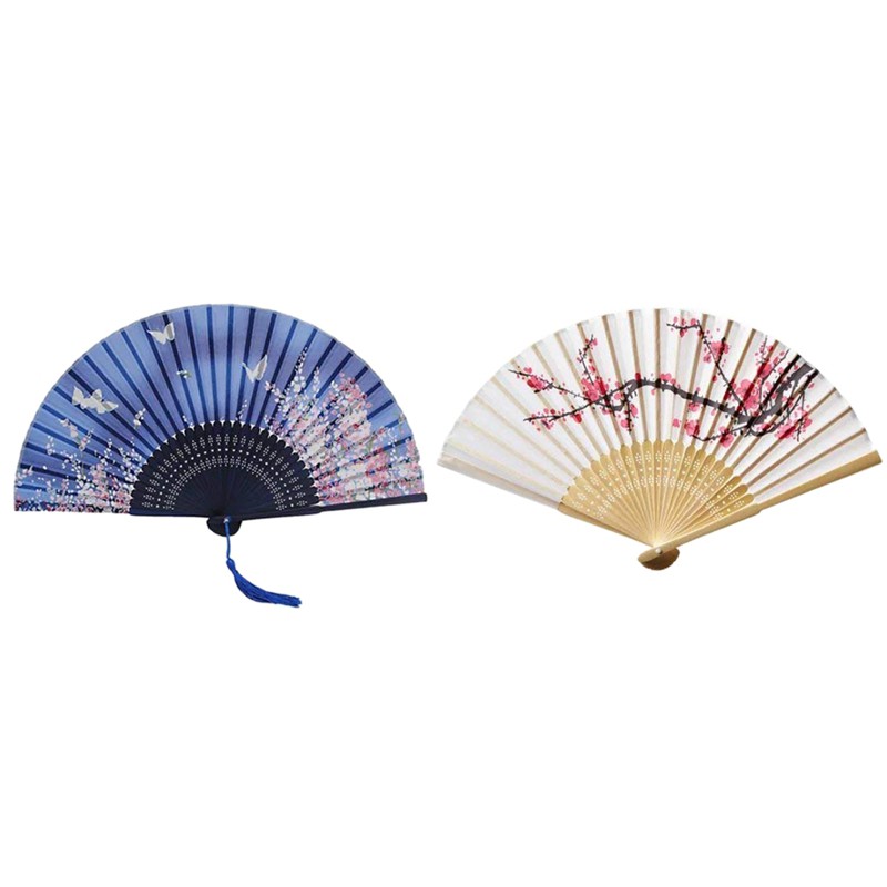 2pcs Vintage Folding Flower Fan Sakura Cherry Blossom Tassel Hand